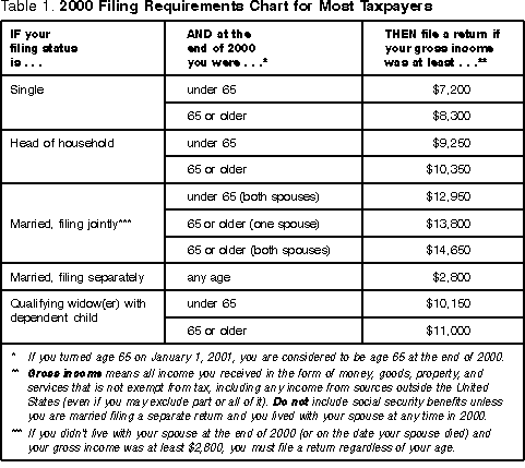 Table 1. 2000 Filing Requirements Chart for Most Taxpayers