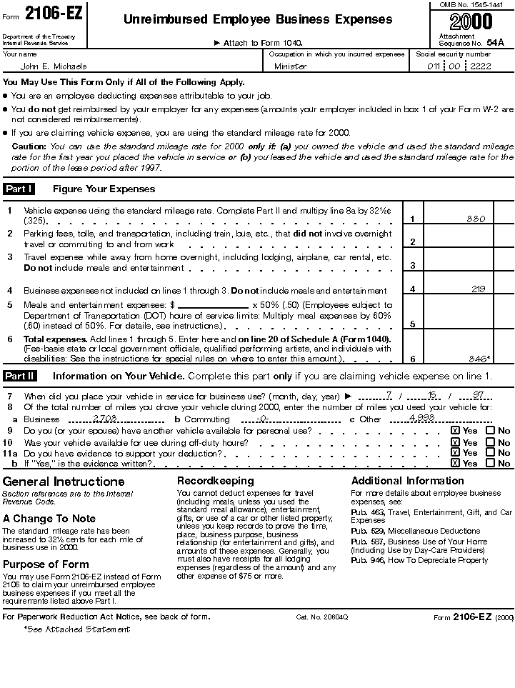 Rev. Michaels fills out Form 2106-EZ to report the