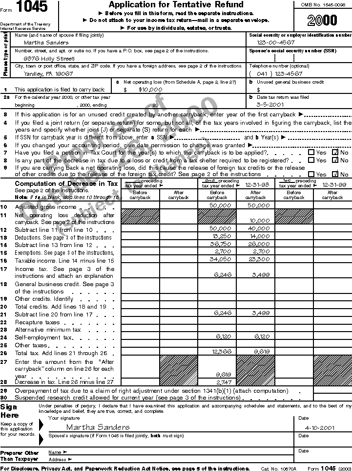 Martha figures her 2000 NOL on Schedule A, Form 1045 (not shown).
