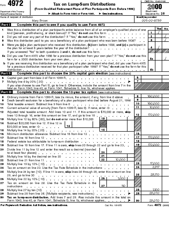 10-year tax option. He enters $140,000 on Form 4972, Part III, line 8.