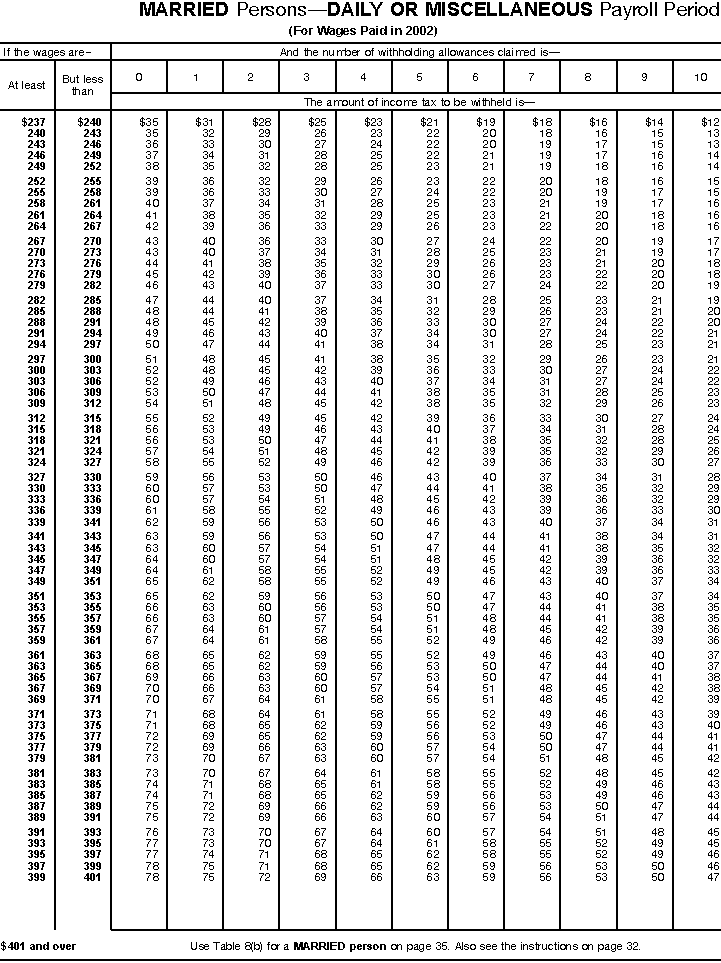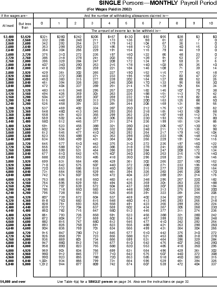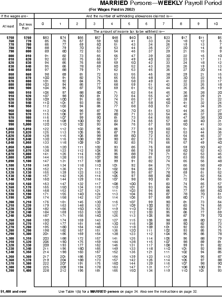 $52,000. Subtract $12,000 (the value of four withholding allowances for 2002) for a balance of $40,000. Using the table for the annual payroll period