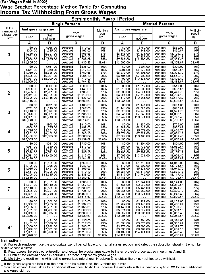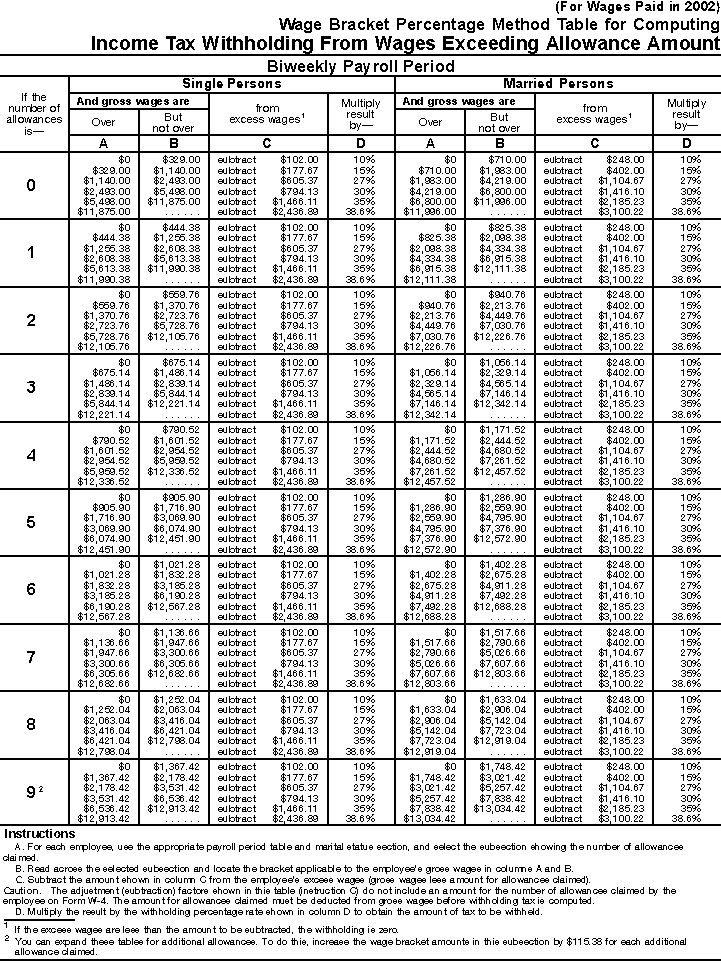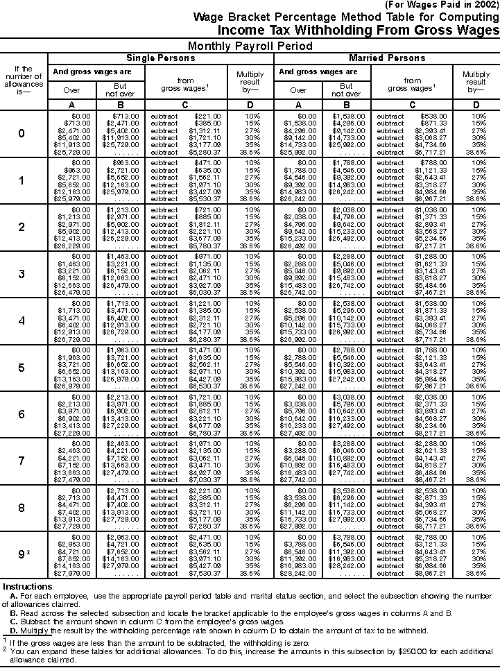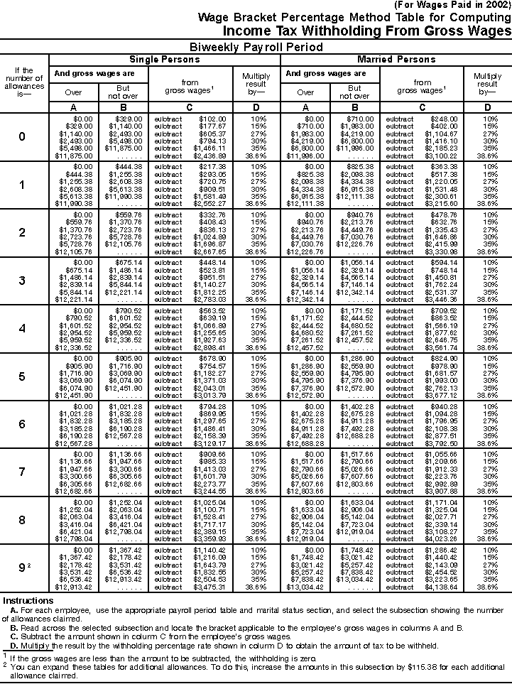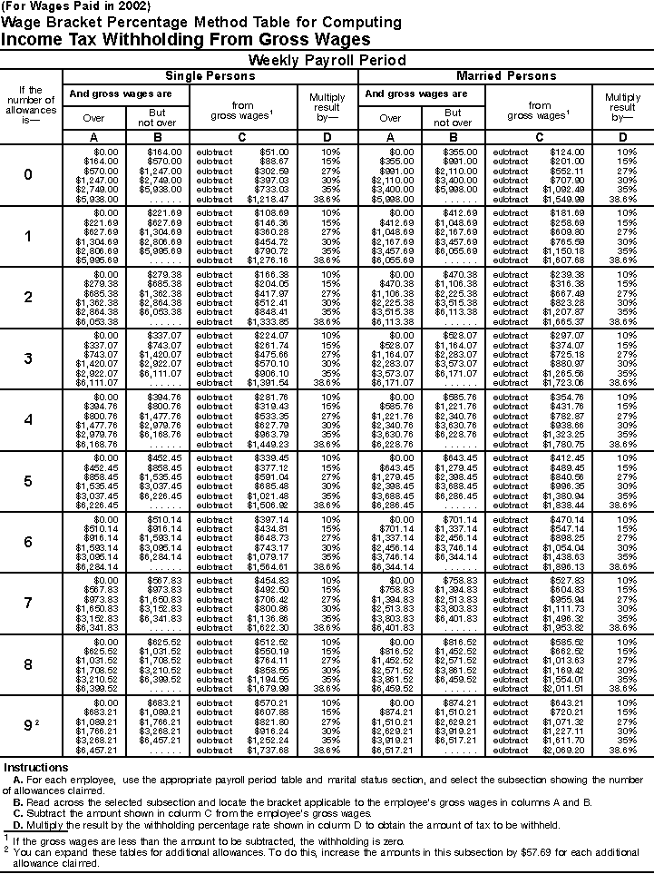 The Wage Bracket Percentage Method Tables show the gross wage brackets that apply to each withholding percentage rate for employees with