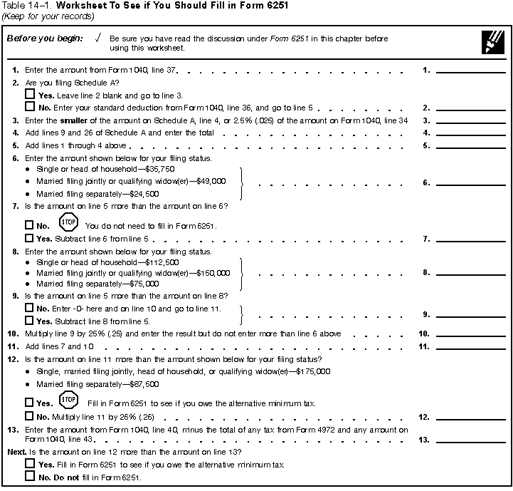 Fill in Form 6251 instead of using the worksheet if you claimed or