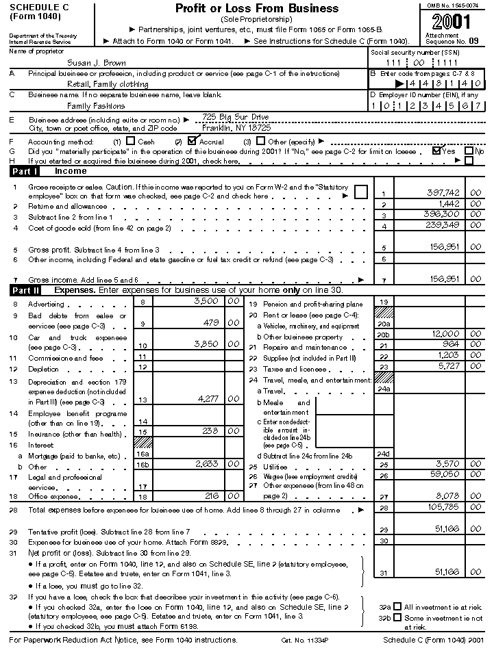 Page 1 of Schedule C (Form 1040) for Susan J. Brown