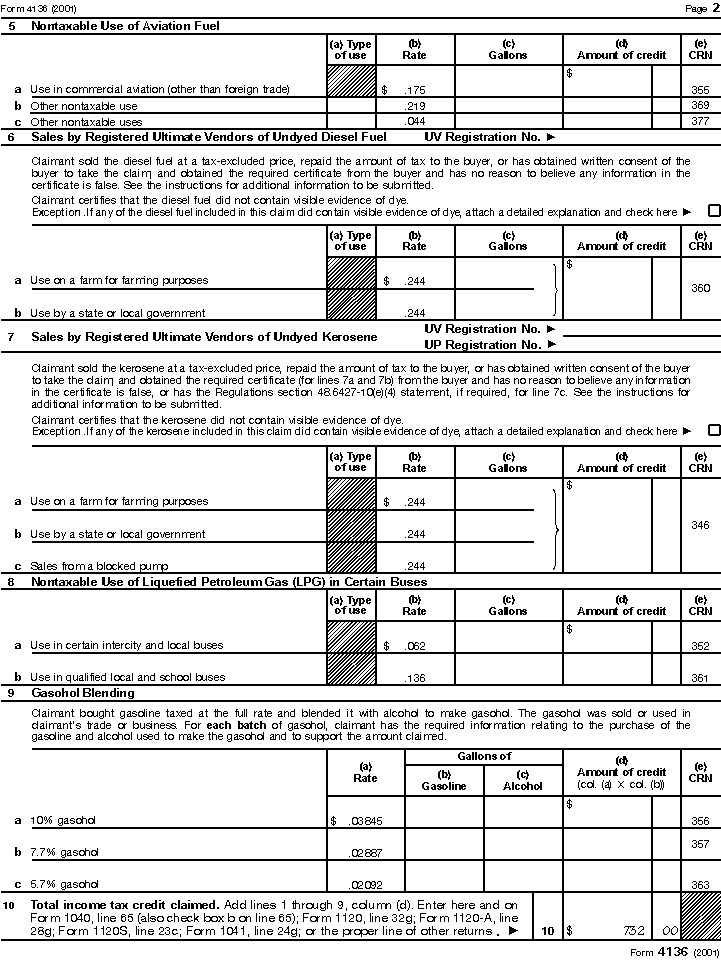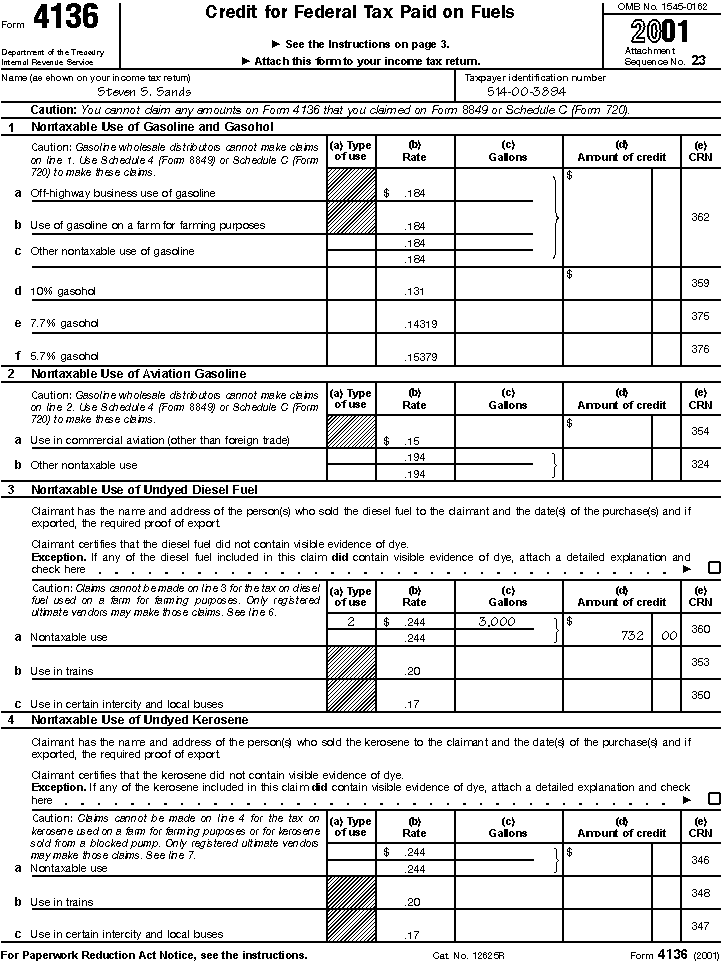 Because the tax is less than $750, Steven must claim a credit for the tax on his 2001 income tax return. He fills out Form 4136 (shown later) and