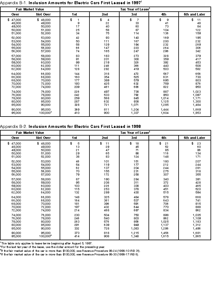 Appendices B-1 through B-5 show the lease inclusion amounts that you may need to report if you leased an electric car.