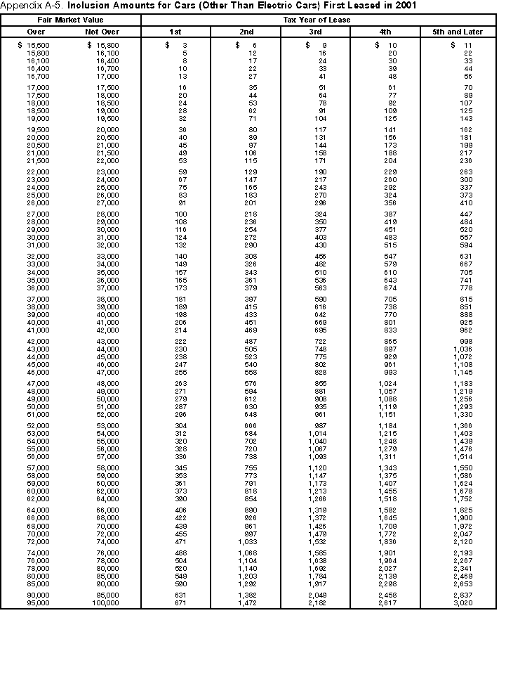 Appendices A-1 through A-5 show the lease inclusion amounts that you may need to report if you leased a car (other than an electric
