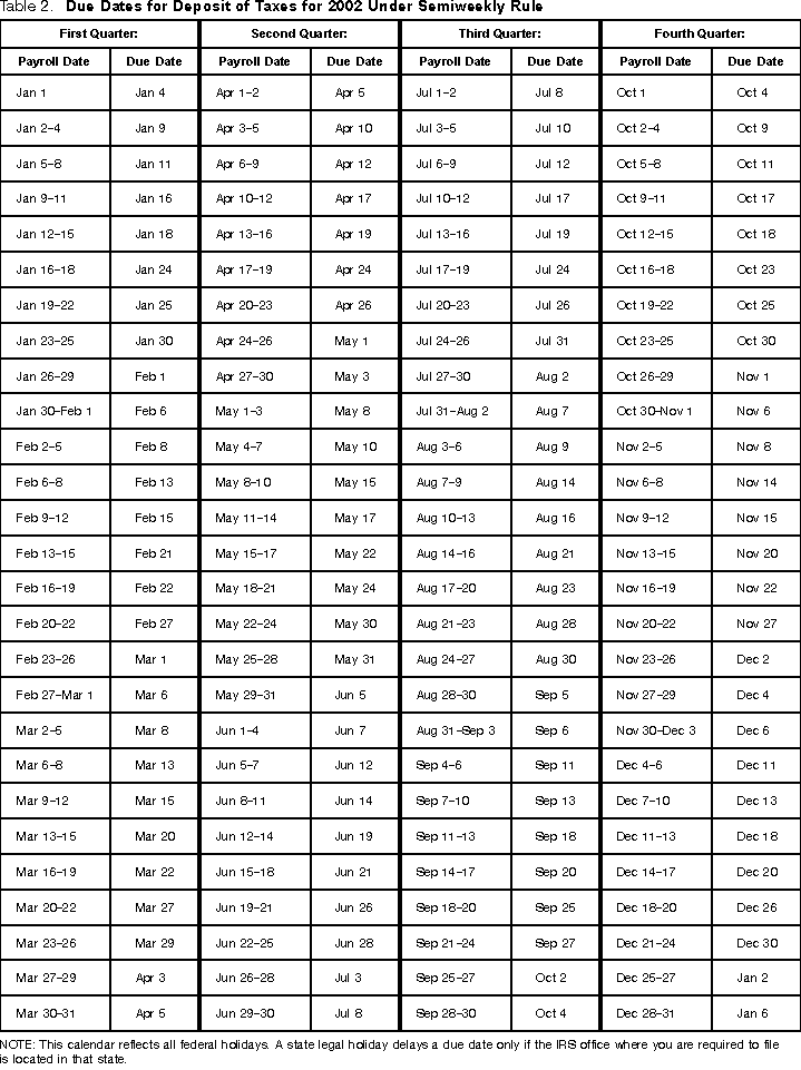 due dates for deposit of taxes for 2002 under semiweekly rule