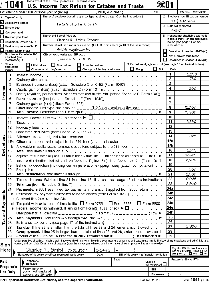 $600, so you must file an income tax return, Form 1041, for 2002 (not shown). The estate's gross income for 2002 is $850 (dividends $500 and interest