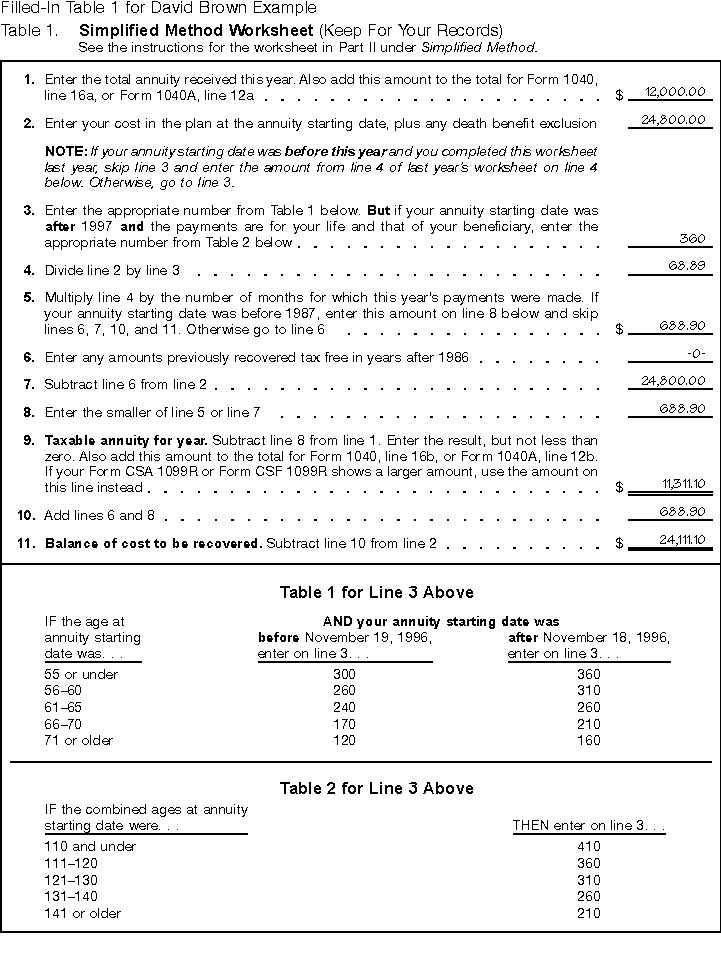 Instead of Table 1, you can generally use the Simplified Method Worksheet in the instructions for Form 1040 or Form 1040A to figure your taxable