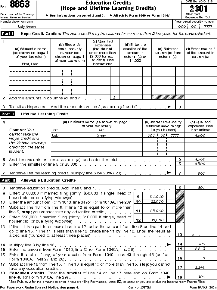 In Appendix A at the end of this publication, there is an example illustrating the use of Form 8863 when the Hope credit and the