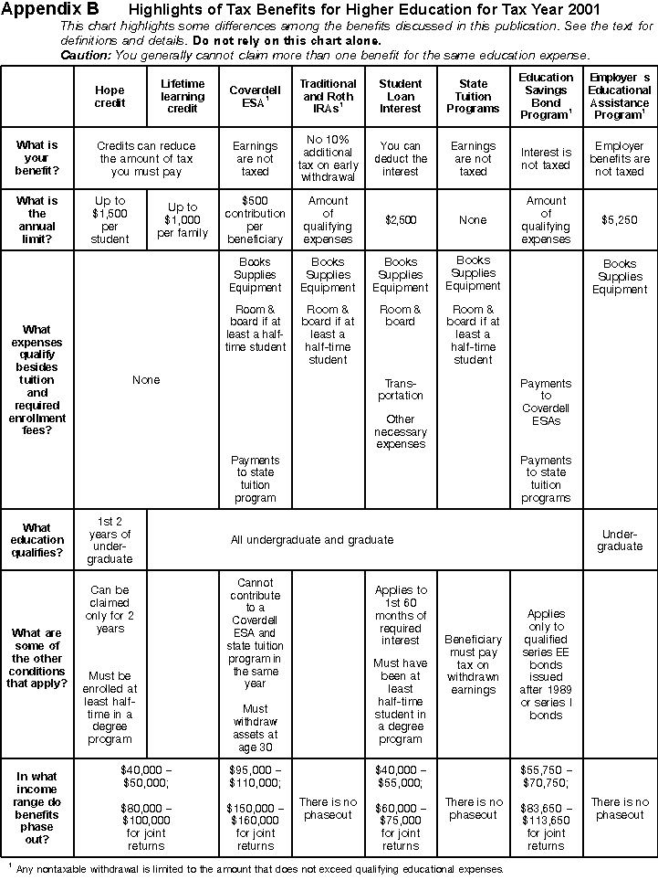 - Appendix B-- A chart summarizing some of the differences between the different higher education tax benefits