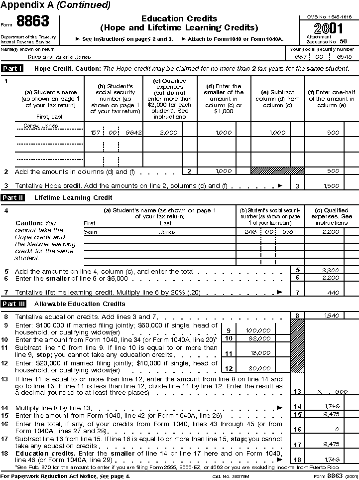 - Appendix A-- An Illustrated Example of Education Credits including a filled-in Form 8863 showing how to claim