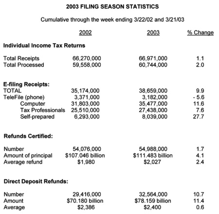 At the half-way point, the IRS has received 66.9 million individual returns, 38.7 million of which were filed electronically. IRS e-file continues to post large gains among tax professionals who e-filed 27.4 million returns, a 7.6 percent increase. However, the largest gain continues to be among people who prepare their own taxes on their computers. So far, 8 million individuals, a 27.7 percent increase over 2002, had prepared and e-filed their own tax returns.