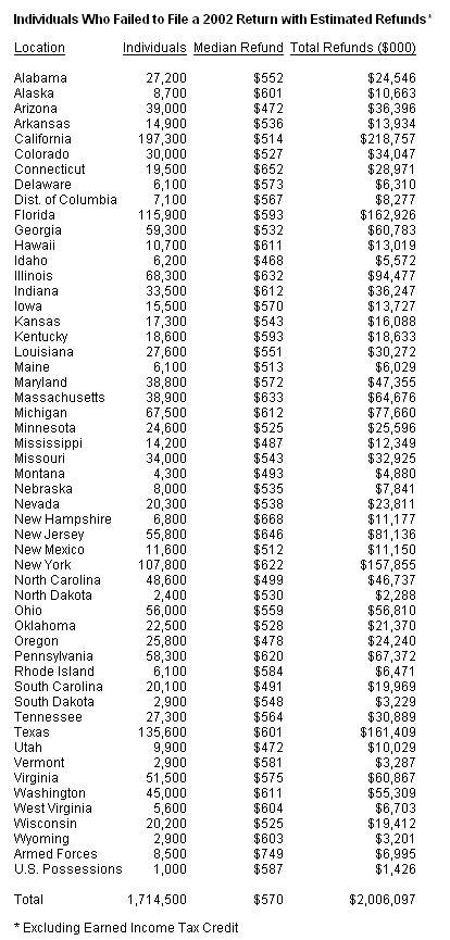 A state-by-state breakdown of estimates for individuals who failed to file a 2002 return with a refund due is attached.