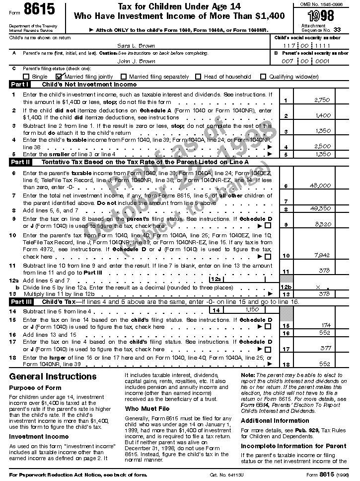 The following example includes a completed Form 8615.