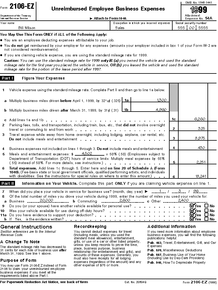 Form 2106-EZ, Page 1, for Bill Wilson