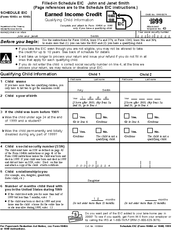 Schedule EIC. The Smiths fill out Qualifying Child Information