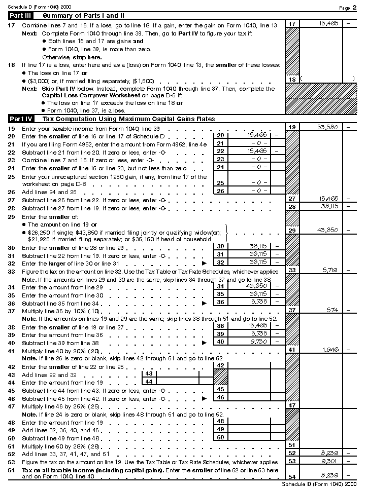 tax on $19,000 using Part IV of Schedule D (not shown) and enters the