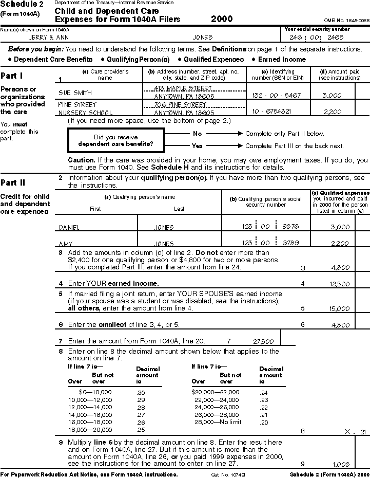 dependent care expenses. A filled-in page 1 of Schedule 2 (Form 1040A)