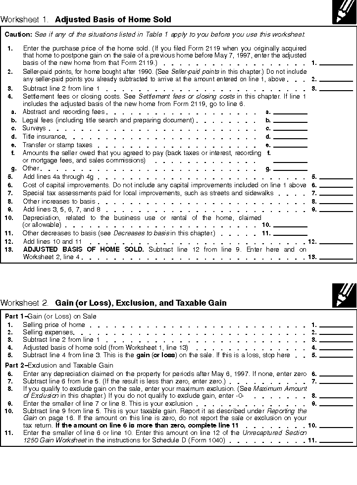 Worksheet 1. Adjusted Basis of Home Sold and Worksheet 2. Gain (or Loss), Exclusion and Taxable Gain