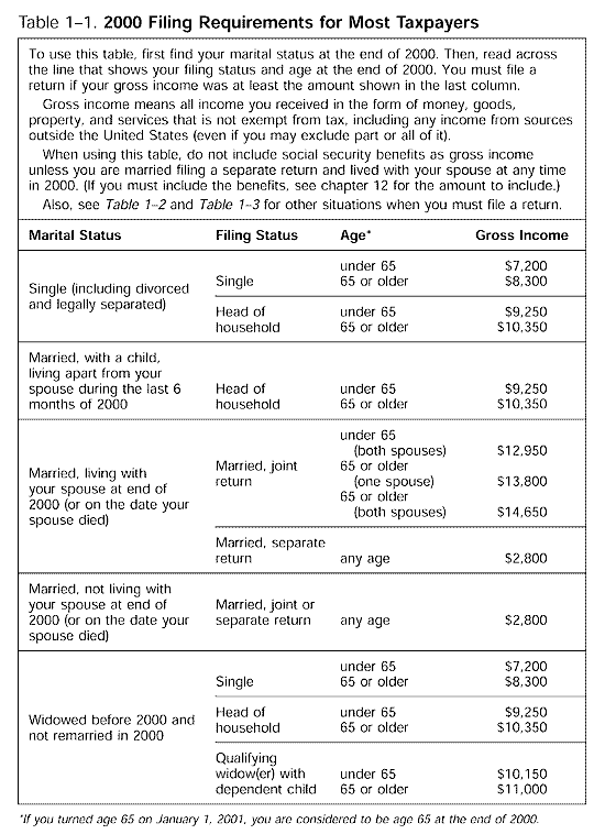 If you are 65 or older at the end of the year, you generally can have a higher amount of gross income than other taxpayers before you must file. See Table 1-1. You are considered 65 on the day before your 65th birthday. For example, if your 65th birthday was on January 1, 2001, you are considered 65 for 2000. Table 1-1 Filing Requirements for Most Taxpayers
