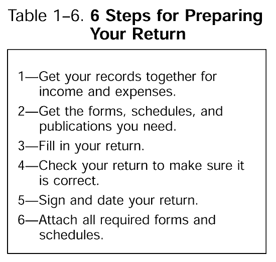 This section explains how to get ready to fill in your tax return and when to report your income and expenses. It also explains how to complete certain sections of the form. You may find Table 1-6 helpful when you prepare your return.