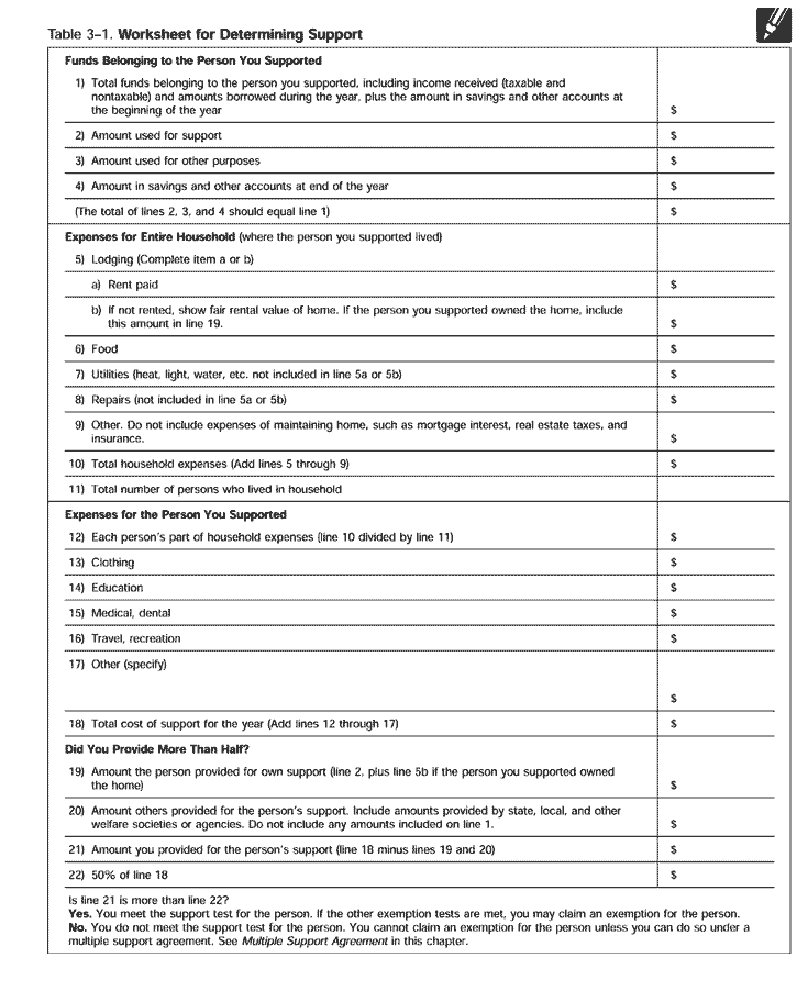 You must apply the support test separately to each parent. You provide $2,000 ($1,000 lodging, $1,000 food) of your fathers total support of $4,100--less than half. You provide $2,600 to your mother ($1,000 lodging, $1,000 food, $600 medical)--more than half of her total support of $4,700. You meet the support test for your mother, but not your father. Heat and utility costs are included in the fair rental value of the lodging, so these are not considered separately. Table 3-1. Worksheet for Determining Support