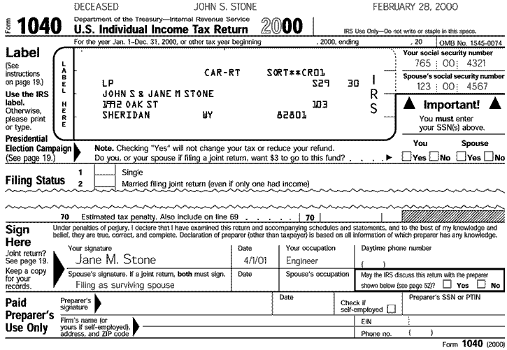 John Stone died in early 2000. He was survived by his wife Jane. Their final joint return included the required information as shown later in the illustration of the top of Form 1040. Form 1040 Label and Signature Area