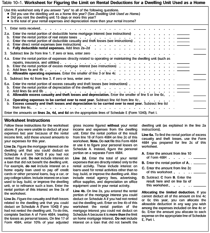 Your deductible rental expenses can be more than your gross rental income. However, see Limits on Rental Losses, later. Table 10-1 Worksheet for figuring limit on rental deductions