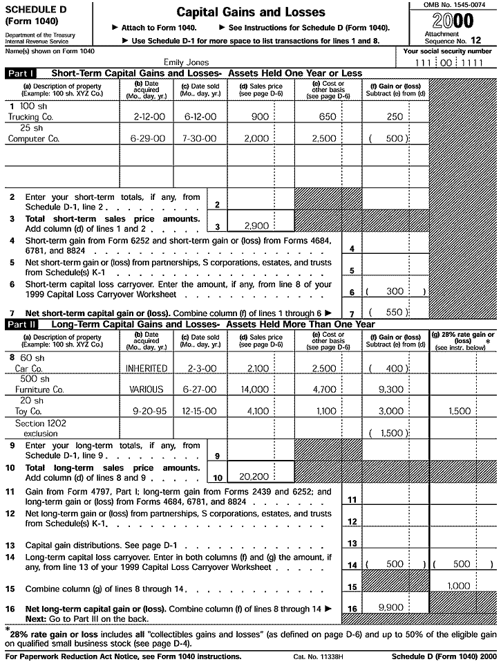 Emily Jones is single and, in addition to wages from her job, she has income from stocks and other securities. For the 2000 tax year, she had the following capital gains and losses, which she reports on Schedule D. All the Forms 1099 she received showed net sales prices. Her filled-in Schedule D is shown in this chapter.