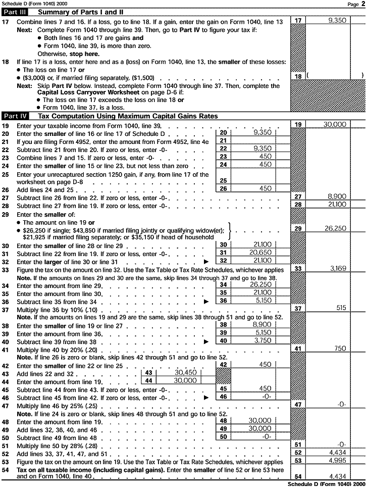 Because Emily has gains on both lines 16 and 17 of Schedule D and has taxable income, she uses Part IV of Schedule D to figure her tax. She had already filled out her Form 1040 through line 39 and enters the amount from that line, $30,000, on line 19 of Schedule D. After filling out the rest of Part IV, she finds that her tax is $4,434. This is less than the tax she would have found using the Tax Table, $4,995.