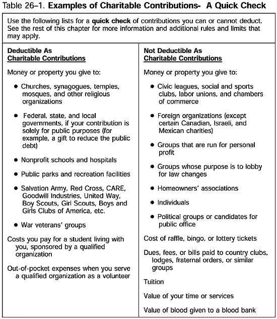 Table 26-1 lists some examples of contributions you can deduct and some that you cannot deduct.