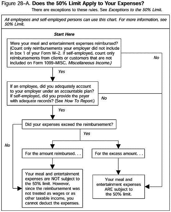 limits, later.) The 50% limit applies to employees or their employers, and to self-employed persons (including independent contractors) or their clients, depending on whether the expenses are reimbursed. Figure 28-A summarizes the general rules explained in this section.