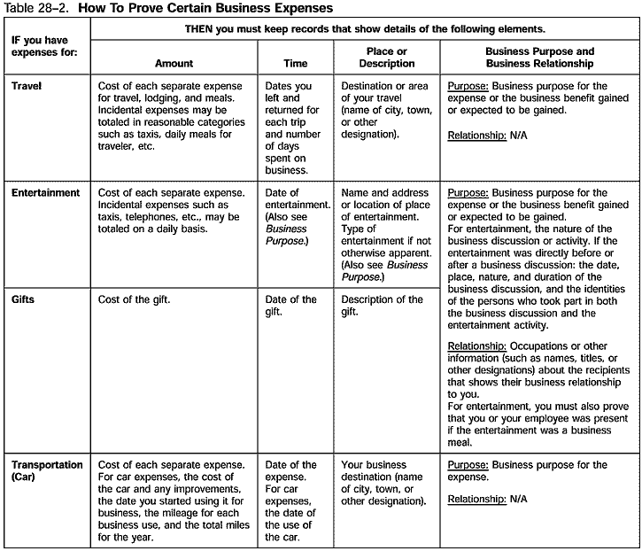 Table 28-2 is a summary of records you need to prove each expense discussed in this chapter. You must be able to prove the elements listed across the top portion of the chart. You prove them by having the information and receipts (where needed) for the expenses listed in the first column.