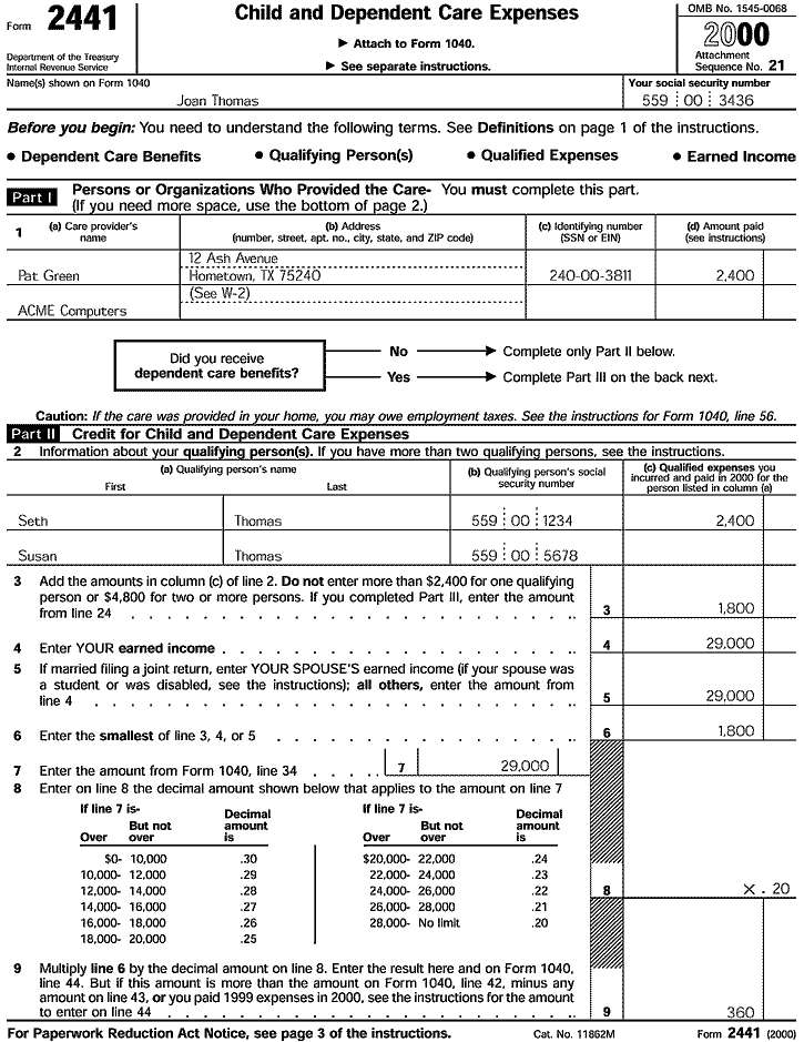 The following example shows how to figure the credit for child and dependent care expenses for two children when employer dependent care benefits are involved. The filled-in Form 2441 is shown at the end of this chapter.
