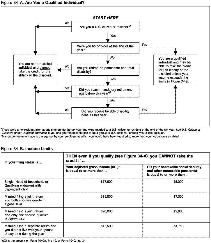 Use Figure 34-A first to see if you are a qualified individual. If you are, go to Figure 34-B to make sure your income is not too high to take the credit.
