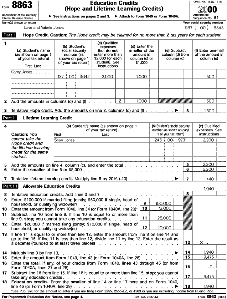 Dave and Valerie are married and file a joint tax return. For 2000, they claim exemptions for their two dependent children on their tax return, and their modified adjusted gross income is $72,000. Their son, Sean, will receive his bachelors degree in psychology from the state college in May 2001. Their daughter, Corey, enrolled full-time at that same college in August 1999 to begin working on her bachelors degree in physical education. In December 1999, Dave and Valerie paid $2,000 for each childs tuition for the winter 2000 semester. In July 2000, they paid $2,200 in tuition costs for each of them for the fall 2000 semester. Form 8863 for Dave and Valerie
