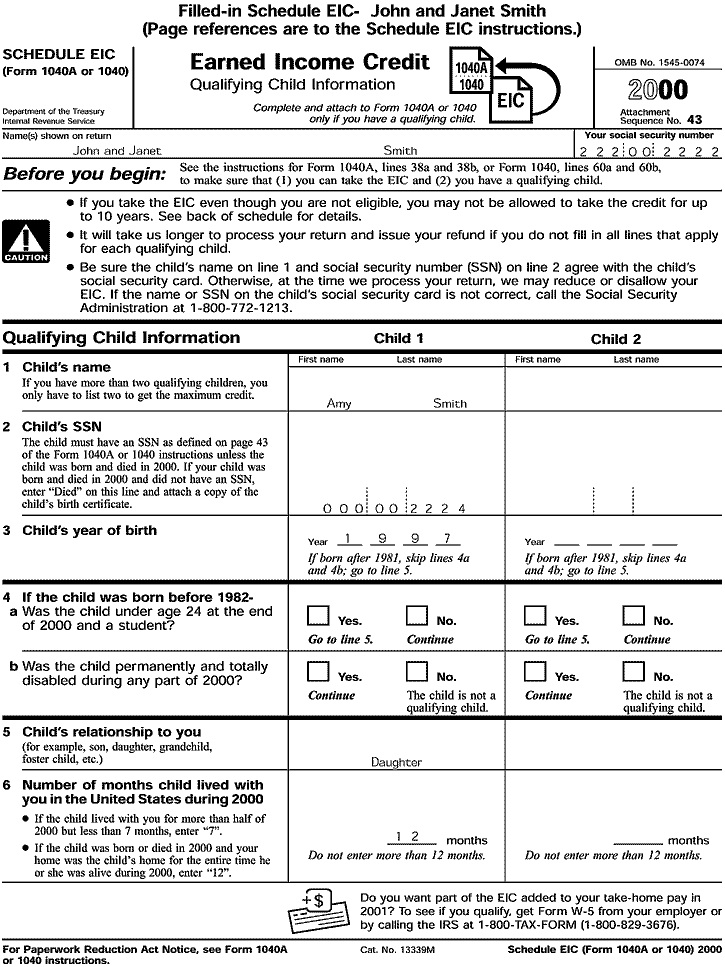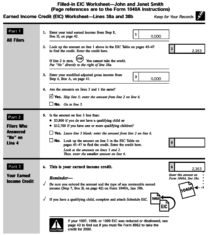 John and Janet Smith are married and will file a joint return. They have one child--Amy, who is 3 years old. Amy lived with John and Janet for all of 2000. John worked and earned $9,500. Janet worked part of the year and earned $1,500. Their total earned income and modified AGI is $11,000. John and Janet qualify for the earned income credit and fill out the EIC Worksheet and Schedule EIC. The Smiths will attach Schedule EIC to Form 1040A when they send their completed return to the IRS.