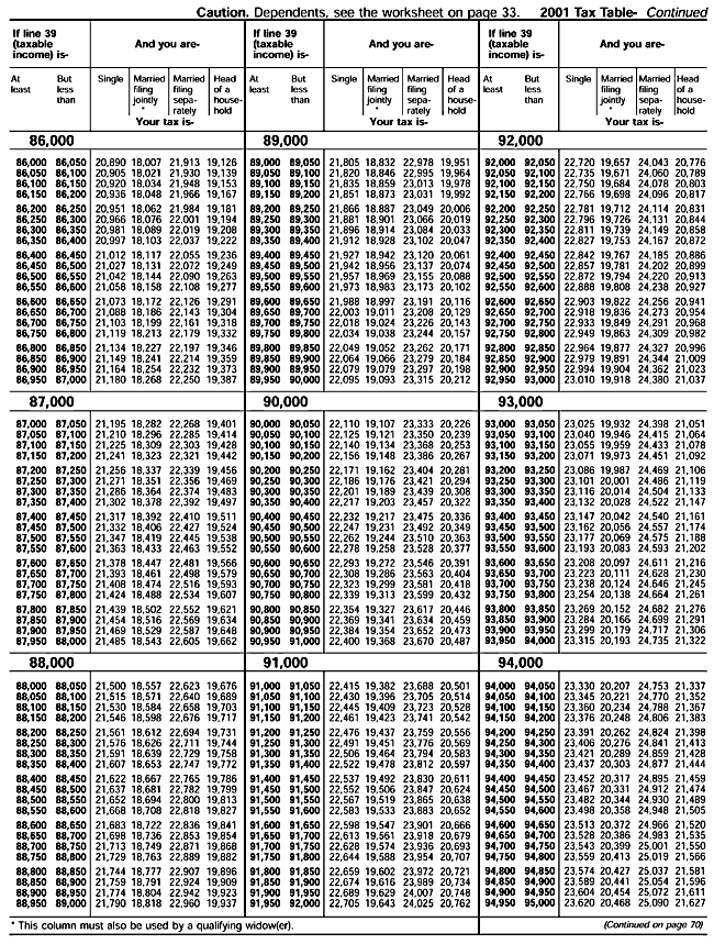 2001 Tax Table