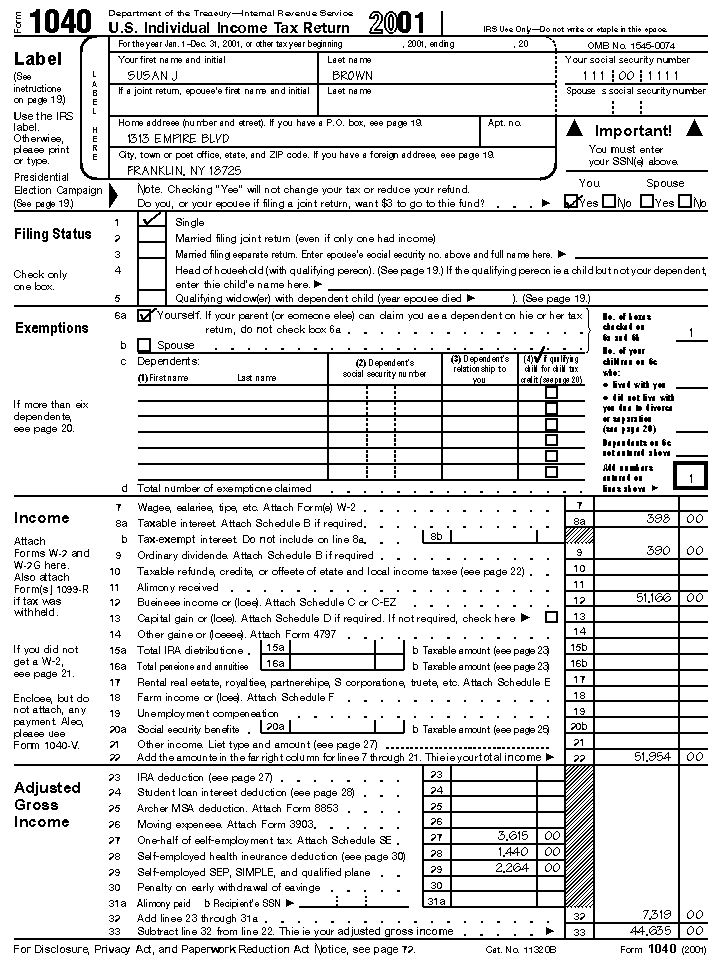 daytime telephone number, and "2001 Form 1040." Her name and