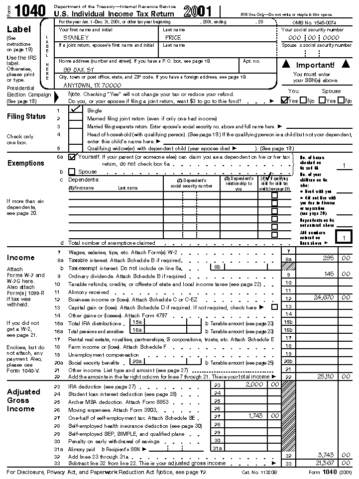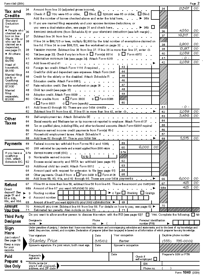 Stanley fills out Form 1040 as follows: