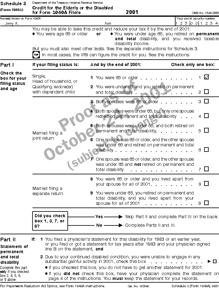 Check the box in Part I of Schedule 3 for your filing status and age.