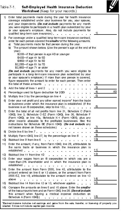 Table 7-1. Self-Employed Health Insurance Deduction Worksheet