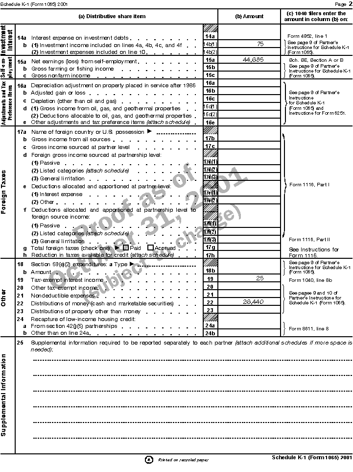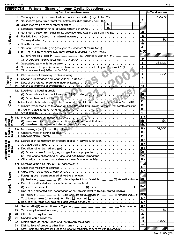 On Schedule K, Frank lists the total of both partners' shares of income, deductions, credits, etc. Each partner's distributive share of income,