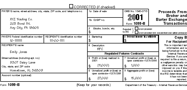 subtracted from her 2001 profit.) These amounts are shown in boxes 6, 7, and 8 of the Form 1099-B she received from her broker. Box 9 shows her