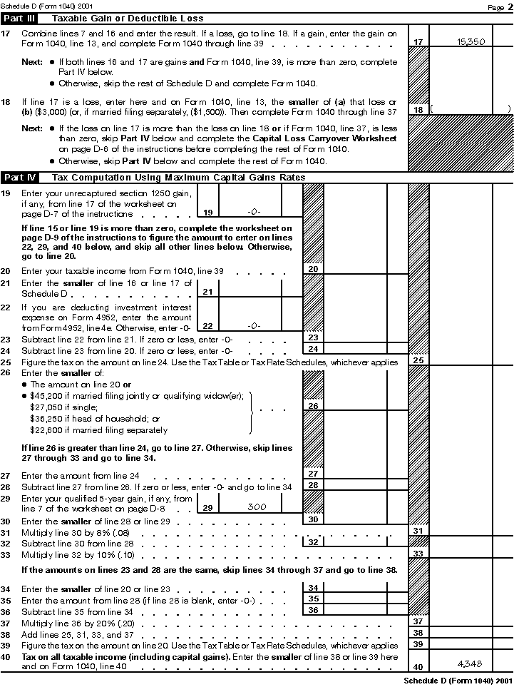 shown on the Forms 1099-B she received from her broker. For 2001, the total of lines 3 and 10 of Schedule D is $14,100, which is the same amount