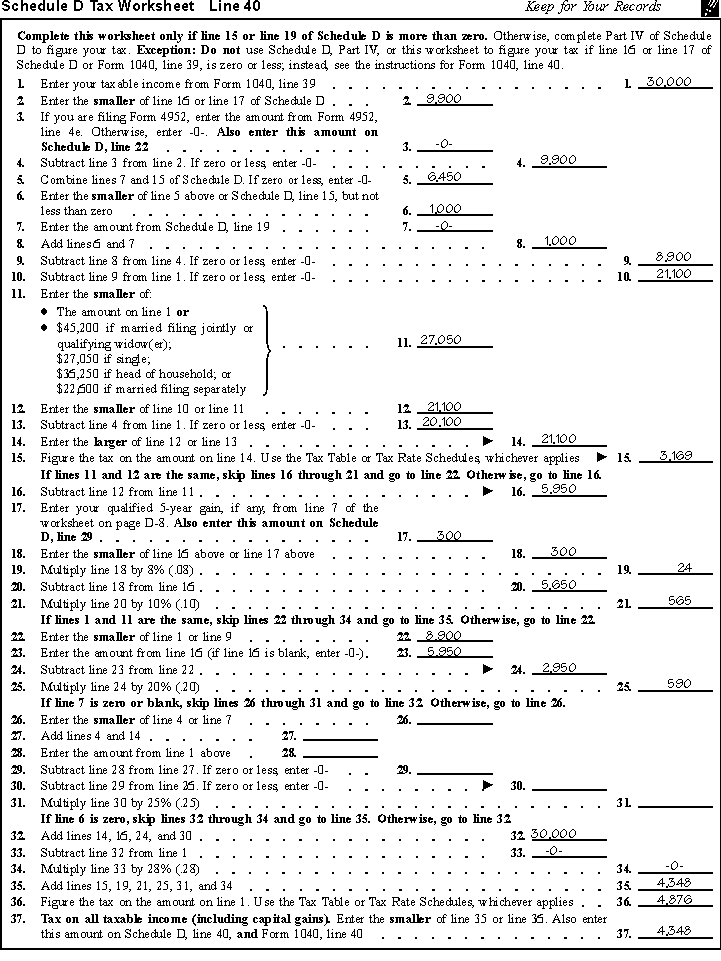 that line, $30,000, on line 1 of the Schedule D Tax Worksheet. After filling out the rest of that worksheet, she figures her tax is $4,348.