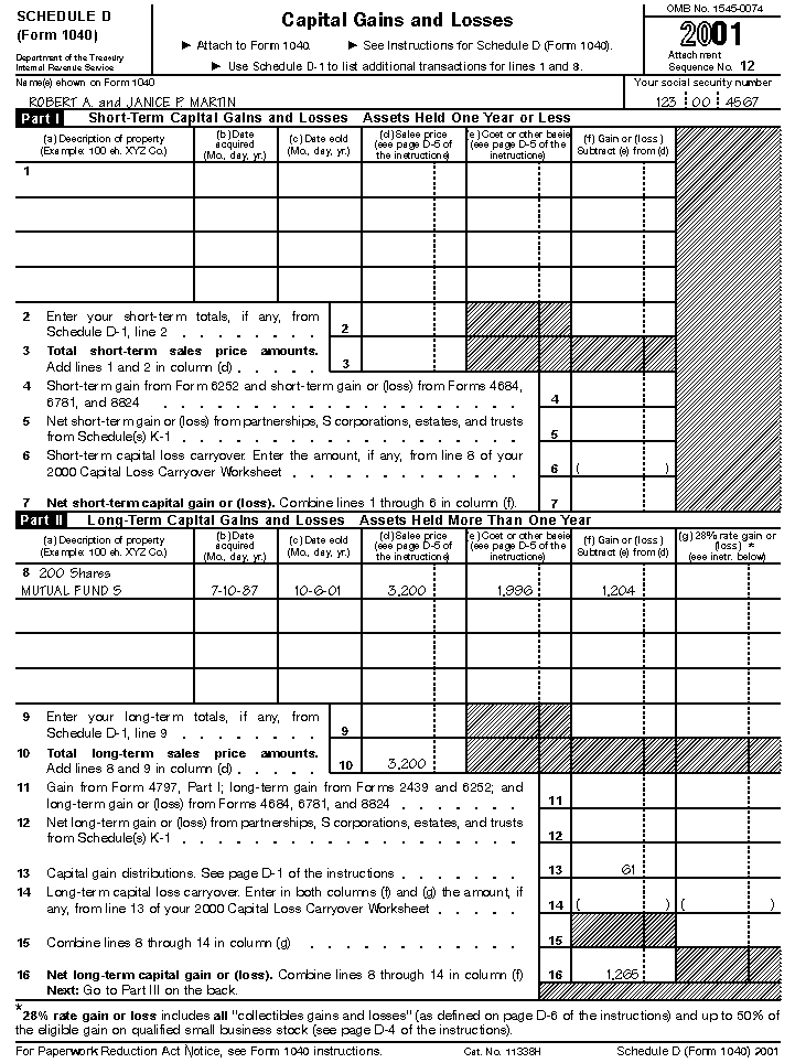 - $1,204 gain from the sale of 200 shares of Mutual Fund S on October 6, 2001. They received Form 1099-B, and they report the sale on