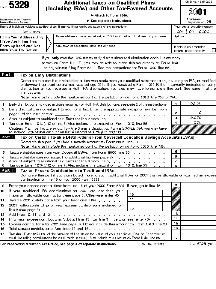 in his gross income for the year of the distribution and pay income tax on it. Tom must also pay an additional tax of $300 (10% × $3,000). He